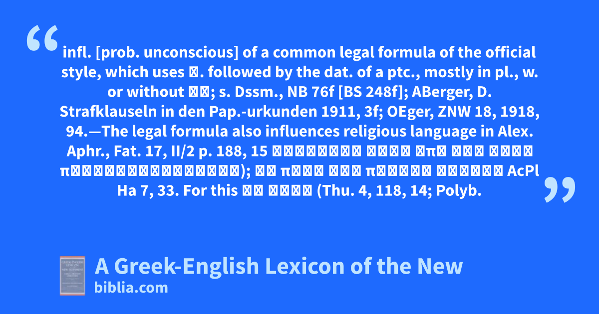 infl. [prob. unconscious] of a common legal formula of the official style, which uses ἐ. followed by the dat. of a ptc., mostly in pl., w. or without ἐν; s. Dssm., NB 76f [BS 248f]; ABerger, D. Strafklauseln in den Pap.-urkunden 1911, 3f; OEger, ZNW 18, 1918, 94.—The legal formula also influences religious language in Alex. Aphr., Fat. 17, II/2 p. 188, 15 ἐμμένειν τοῖς ὑπὸ τῶν θεῶν προαγορευομένοις); τῇ πρὸς τὸν πατέρα κλήσει AcPl Ha 7, 33. For this ἔν τινι (Thu. 4, 118, 14; Polyb.