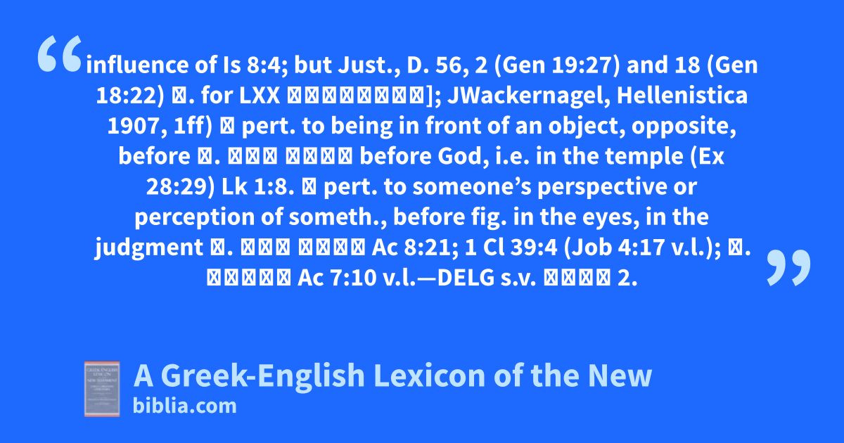 influence of Is 8:4; but Just., D. 56, 2 (Gen 19:27) and 18 (Gen 18:22) ἔ. for LXX ἐναντίον]; JWackernagel, Hellenistica 1907, 1ff) ① pert. to being in front of an object, opposite, before ἔ. τοῦ θεοῦ before God, i.e. in the temple (Ex 28:29) Lk 1:8. ② pert. to someone’s perspective or perception of someth., before fig. in the eyes, in the judgment ἔ. τοῦ θεοῦ Ac 8:21; 1 Cl 39:4 (Job 4:17 v.l.); ἔ. Φαραώ Ac 7:10 v.l.—DELG s.v. ἄντα 2.