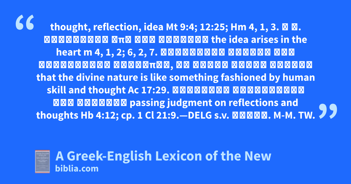 thought, reflection, idea Mt 9:4; 12:25; Hm 4, 1, 3. ἡ ἐ. ἀναβαίνει ἐπὶ τὴν καρδίαν the idea arises in the heart m 4, 1, 2; 6, 2, 7. χαράγματι τέχνης καὶ ἐνθυμήσεως ἀνθρώπου, τὸ θεῖον εἶναι ὅμοιον that the divine nature is like something fashioned by human skill and thought Ac 17:29. κριτικὸς ἐνθυμήσεων καὶ ἐννοιῶν passing judgment on reflections and thoughts Hb 4:12; cp. 1 Cl 21:9.—DELG s.v. θυμός. M-M. TW.