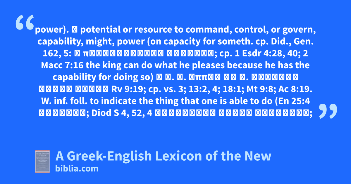 power). ② potential or resource to command, control, or govern, capability, might, power (on capacity for someth. cp. Did., Gen. 162, 5: ἡ προσαιρέσεως ἐξουσία; cp. 1 Esdr 4:28, 40; 2 Macc 7:16 the king can do what he pleases because he has the capability for doing so) ἡ ἐ. τ. ἵππων ἐν τ. στόματι αὐτῶν ἐστιν Rv 9:19; cp. vs. 3; 13:2, 4; 18:1; Mt 9:8; Ac 8:19. W. inf. foll. to indicate the thing that one is able to do (En 25:4 ἅψασθαι; Diod S 4, 52, 4 ἀμύνασθαι εἶχεν ἐξουσίαν;