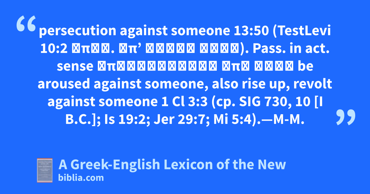 persecution against someone 13:50 (TestLevi 10:2 ἐπεγ. ἐπʼ αὐτὸν κακά). Pass. in act. sense ἐπεγείρεσθαι ἐπί τινα be aroused against someone, also rise up, revolt against someone 1 Cl 3:3 (cp. SIG 730, 10 [I B.C.]; Is 19:2; Jer 29:7; Mi 5:4).—M-M.