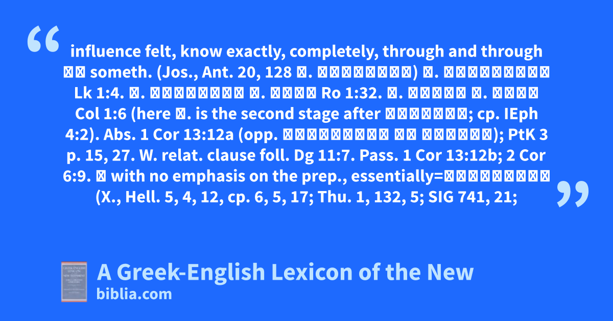 influence felt, know exactly, completely, through and through τὶ someth. (Jos., Ant. 20, 128 τ. ἀλήθειαν) τ. ἀσφάλειαν Lk 1:4. τ. δικαίωμα τ. θεοῦ Ro 1:32. τ. χάριν τ. θεοῦ Col 1:6 (here ἐ. is the second stage after ἀκούειν; cp. IEph 4:2). Abs. 1 Cor 13:12a (opp. γινώσκειν ἐκ μέρους); PtK 3 p. 15, 27. W. relat. clause foll. Dg 11:7. Pass. 1 Cor 13:12b; 2 Cor 6:9. ⓑ with no emphasis on the prep., essentially=γινώσκειν (X., Hell. 5, 4, 12, cp. 6, 5, 17; Thu. 1, 132, 5; SIG 741, 21;