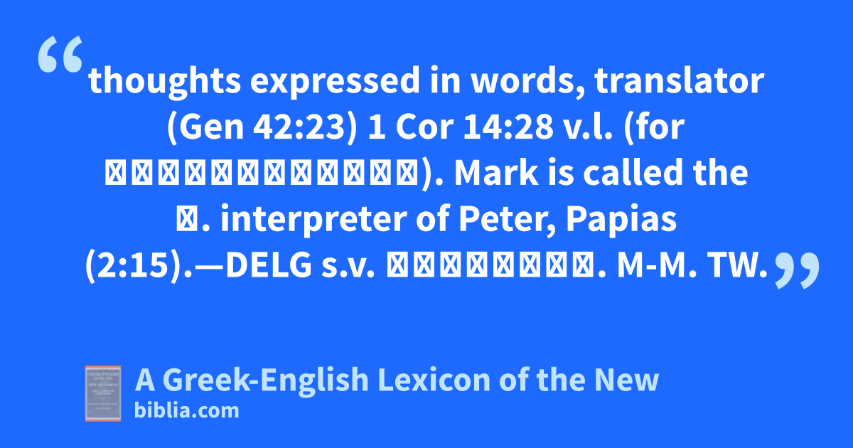 thoughts expressed in words, translator (Gen 42:23) 1 Cor 14:28 v.l. (for διερμηνευτής). Mark is called the ἑ. interpreter of Peter, Papias (2:15).—DELG s.v. ἑρμηνεύς. M-M. TW.