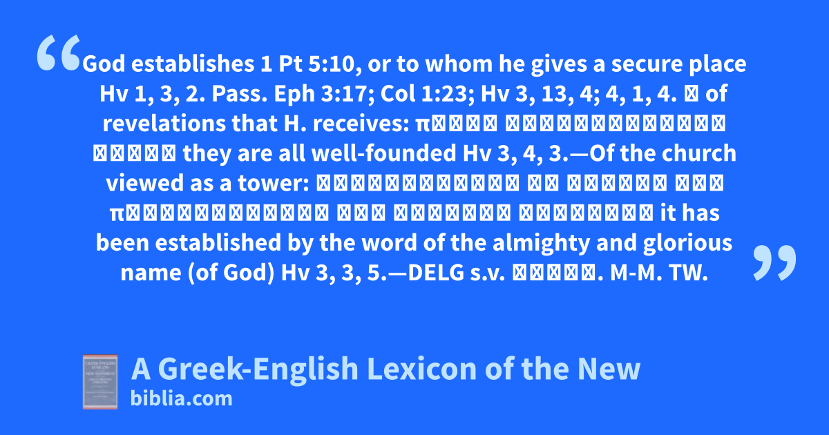 God establishes 1 Pt 5:10, or to whom he gives a secure place Hv 1, 3, 2. Pass. Eph 3:17; Col 1:23; Hv 3, 13, 4; 4, 1, 4. ⓑ of revelations that H. receives: πάντα τεθεμελιωμένα ἐστίν they are all well-founded Hv 3, 4, 3.—Of the church viewed as a tower: τεθεμελίωται τῷ ῥήματι τοῦ παντοκράτορος καὶ ἐνδόξου ὀνόματος it has been established by the word of the almighty and glorious name (of God) Hv 3, 3, 5.—DELG s.v. θεμός. M-M. TW.