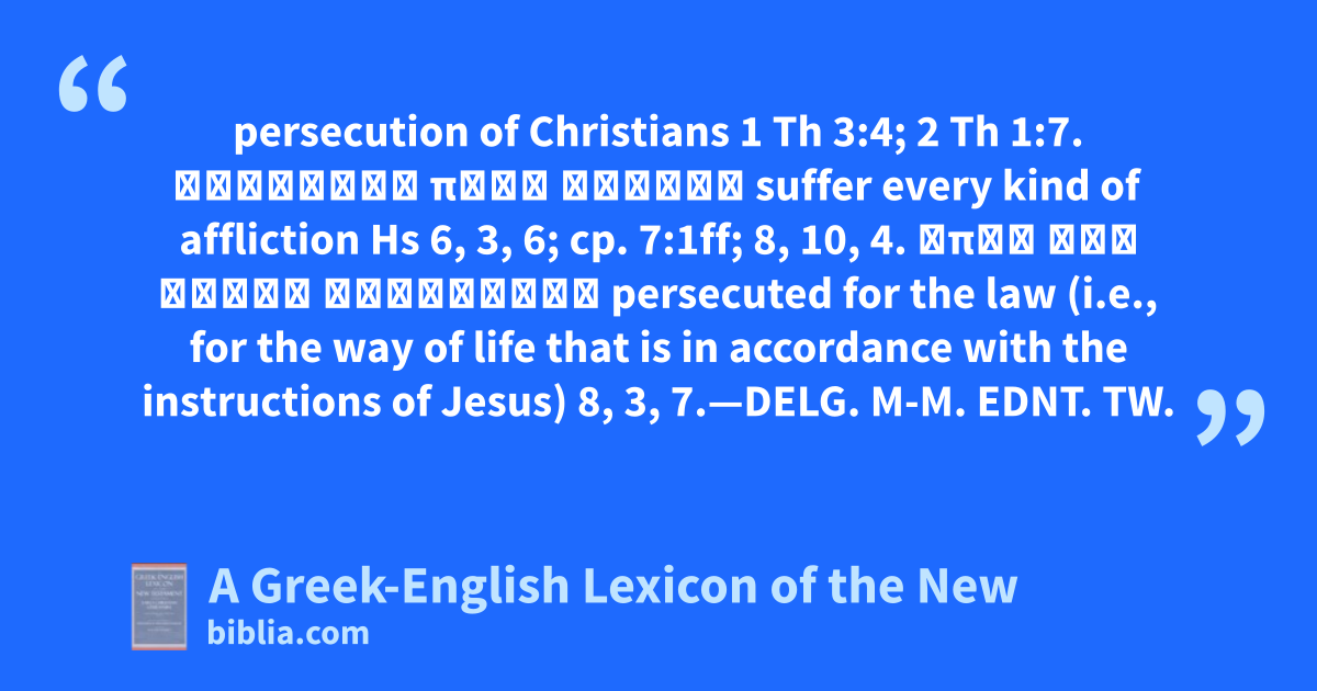 persecution of Christians 1 Th 3:4; 2 Th 1:7. θλιβῆναι πάσῃ θλίψει suffer every kind of affliction Hs 6, 3, 6; cp. 7:1ff; 8, 10, 4. ὑπὲρ τοῦ νόμου θλιβέντες persecuted for the law (i.e., for the way of life that is in accordance with the instructions of Jesus) 8, 3, 7.—DELG. M-M. EDNT. TW.