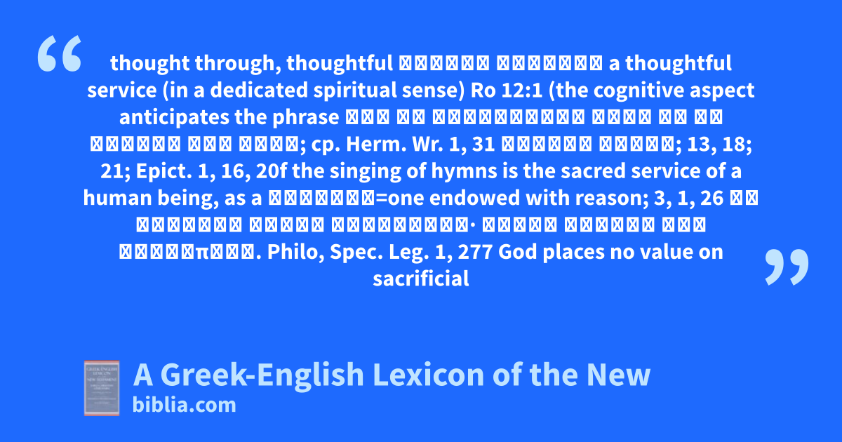 thought through, thoughtful λογικὴ λατρεία a thoughtful service (in a dedicated spiritual sense) Ro 12:1 (the cognitive aspect anticipates the phrase εἰς τὸ δοκιμάζειν ὑμᾶς τί τὸ θέλημα τοῦ θεοῦ; cp. Herm. Wr. 1, 31 λογικὴ θυσία; 13, 18; 21; Epict. 1, 16, 20f the singing of hymns is the sacred service of a human being, as a λογικός=one endowed with reason; 3, 1, 26 τὸ λογικὸν ἔχεις ἐξαίρετον· τοῦτο κόσμει καὶ καλλώπιζε. Philo, Spec. Leg. 1, 277 God places no value on sacrificial