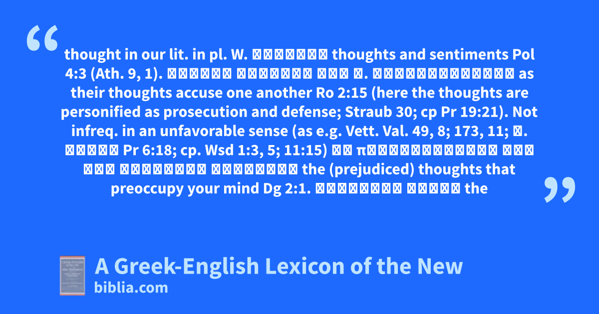 thought in our lit. in pl. W. ἔννοιαι thoughts and sentiments Pol 4:3 (Ath. 9, 1). μεταξὺ ἀλλήλων τῶν λ. κατηγορούντων as their thoughts accuse one another Ro 2:15 (here the thoughts are personified as prosecution and defense; Straub 30; cp Pr 19:21). Not infreq. in an unfavorable sense (as e.g. Vett. Val. 49, 8; 173, 11; λ. κακοί Pr 6:18; cp. Wsd 1:3, 5; 11:15) οἱ προκατέχοντές σου τὴν διάνοιαν λογισμοί the (prejudiced) thoughts that preoccupy your mind Dg 2:1. λογισμοὶ ἐθνῶν the