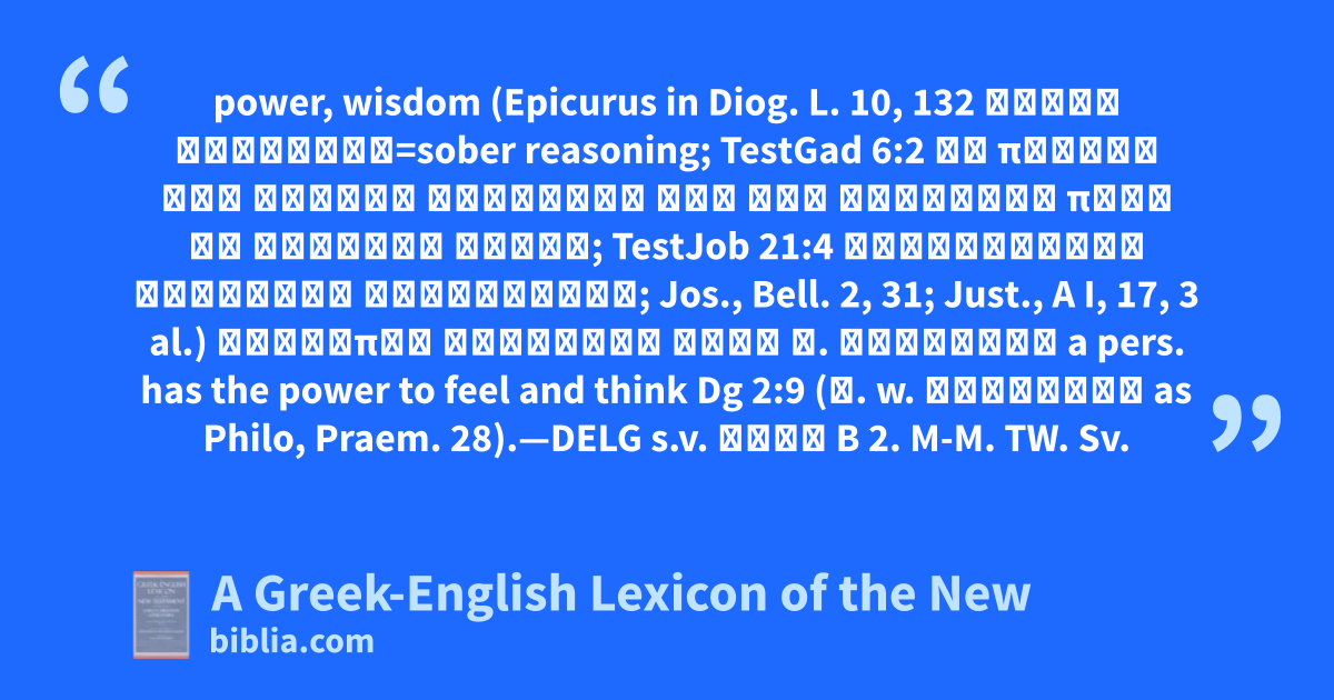 power, wisdom (Epicurus in Diog. L. 10, 132 νήφων λογισμός=sober reasoning; TestGad 6:2 τὸ πνεῦμα τοῦ μίσους ἐτάρασσέ μου τὸν λογισμὸν πρὸς τὸ ἀνελεῖν αὐτόν; TestJob 21:4 ἀνελάμβανον λογισμὸν μακρόθυμον; Jos., Bell. 2, 31; Just., A I, 17, 3 al.) ἄνθρωπος αἴσθησιν ἔχει κ. λογισμόν a pers. has the power to feel and think Dg 2:9 (λ. w. αἴσθησις as Philo, Praem. 28).—DELG s.v. λέγω B 2. M-M. TW. Sv.