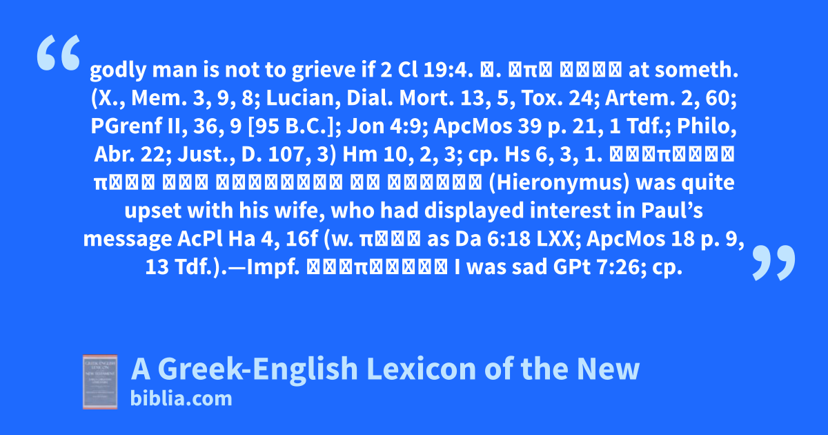 godly man is not to grieve if 2 Cl 19:4. λ. ἐπί τινι at someth. (X., Mem. 3, 9, 8; Lucian, Dial. Mort. 13, 5, Tox. 24; Artem. 2, 60; PGrenf II, 36, 9 [95 B.C.]; Jon 4:9; ApcMos 39 p. 21, 1 Tdf.; Philo, Abr. 22; Just., D. 107, 3) Hm 10, 2, 3; cp. Hs 6, 3, 1. ἐλυπεῖτο περὶ τῆς γυναικὸς οὐ μικρῶς (Hieronymus) was quite upset with his wife, who had displayed interest in Paul’s message AcPl Ha 4, 16f (w. περί as Da 6:18 LXX; ApcMos 18 p. 9, 13 Tdf.).—Impf. ἐλυπούμην I was sad GPt 7:26; cp.