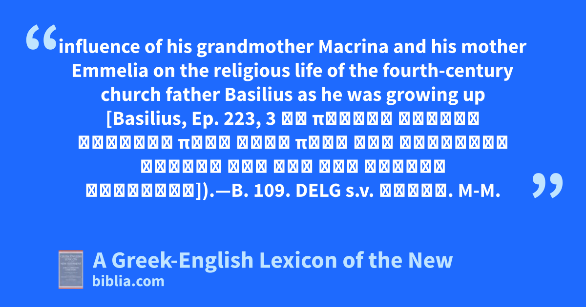 influence of his grandmother Macrina and his mother Emmelia on the religious life of the fourth-century church father Basilius as he was growing up [Basilius, Ep. 223, 3 ἐκ παιδὸς ἔλαβον ἔννοιαν περὶ θεοῦ παρὰ τῆς μακαρίας μητρός μου καὶ τῆς μάμμης Μακρίνης]).—B. 109. DELG s.v. μάμμη. M-M.