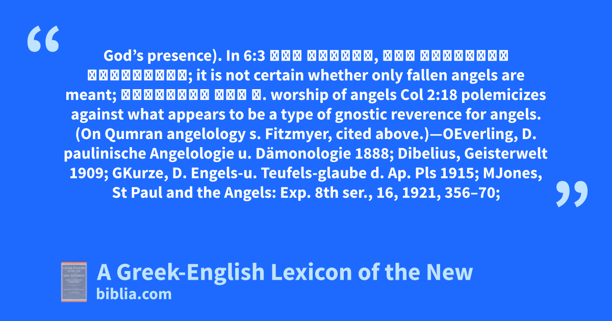 God’s presence). In 6:3 οὐκ οἴδατε, ὅτι ἀγγέλους κρινοῦμεν; it is not certain whether only fallen angels are meant; θρησκείᾳ τῶν ἀ. worship of angels Col 2:18 polemicizes against what appears to be a type of gnostic reverence for angels. (On Qumran angelology s. Fitzmyer, cited above.)—OEverling, D. paulinische Angelologie u. Dämonologie 1888; Dibelius, Geisterwelt 1909; GKurze, D. Engels-u. Teufels-glaube d. Ap. Pls 1915; MJones, St Paul and the Angels: Exp. 8th ser., 16, 1921, 356–70;