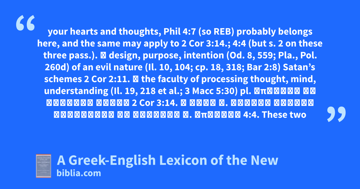 your hearts and thoughts, Phil 4:7 (so REB) probably belongs here, and the same may apply to 2 Cor 3:14.; 4:4 (but s. 2 on these three pass.). ⓑ design, purpose, intention (Od. 8, 559; Pla., Pol. 260d) of an evil nature (Il. 10, 104; cp. 18, 318; Bar 2:8) Satan’s schemes 2 Cor 2:11. ② the faculty of processing thought, mind, understanding (Il. 19, 218 et al.; 3 Macc 5:30) pl. ἐπωρώθη τὰ νοήματα αὐτῶν 2 Cor 3:14. ὁ θεὸς τ. αἰῶνος τούτου ἐτύφλωσεν τὰ νοήματα τ. ἀπίστων 4:4. These two