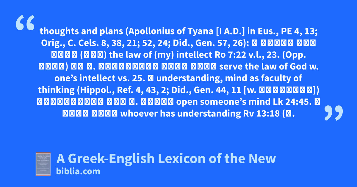 thoughts and plans (Apollonius of Tyana [I A.D.] in Eus., PE 4, 13; Orig., C. Cels. 8, 38, 21; 52, 24; Did., Gen. 57, 26): ὁ νόμος τοῦ νοός (μου) the law of (my) intellect Ro 7:22 v.l., 23. (Opp. σάρξ) τῷ ν. δουλεύειν νόμῳ θεοῦ serve the law of God w. one’s intellect vs. 25. ⓑ understanding, mind as faculty of thinking (Hippol., Ref. 4, 43, 2; Did., Gen. 44, 11 [w. λογισμός]) διανοίγειν τὸν ν. τινος open someone’s mind Lk 24:45. ὁ ἔχων νοῦν whoever has understanding Rv 13:18 (ν.