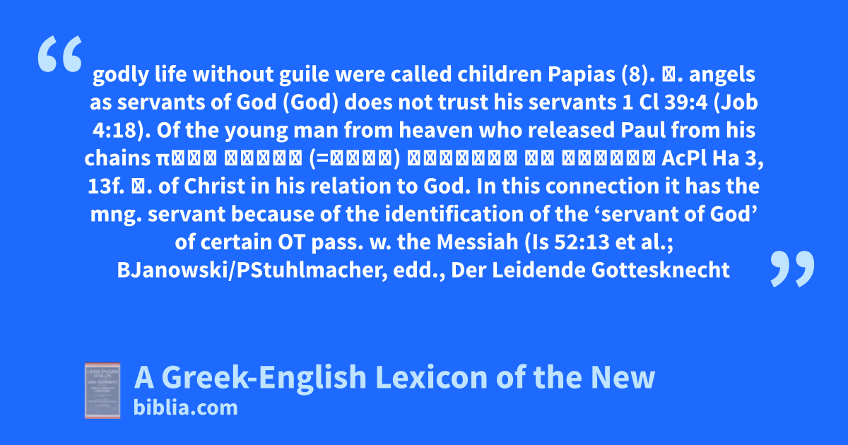 godly life without guile were called children Papias (8). β. angels as servants of God (God) does not trust his servants 1 Cl 39:4 (Job 4:18). Of the young man from heaven who released Paul from his chains παῖς λείαν (=λίαν) εὐειδὴς ἐν χάριτι AcPl Ha 3, 13f. γ. of Christ in his relation to God. In this connection it has the mng. servant because of the identification of the ‘servant of God’ of certain OT pass. w. the Messiah (Is 52:13 et al.; BJanowski/PStuhlmacher, edd., Der Leidende Gottesknecht