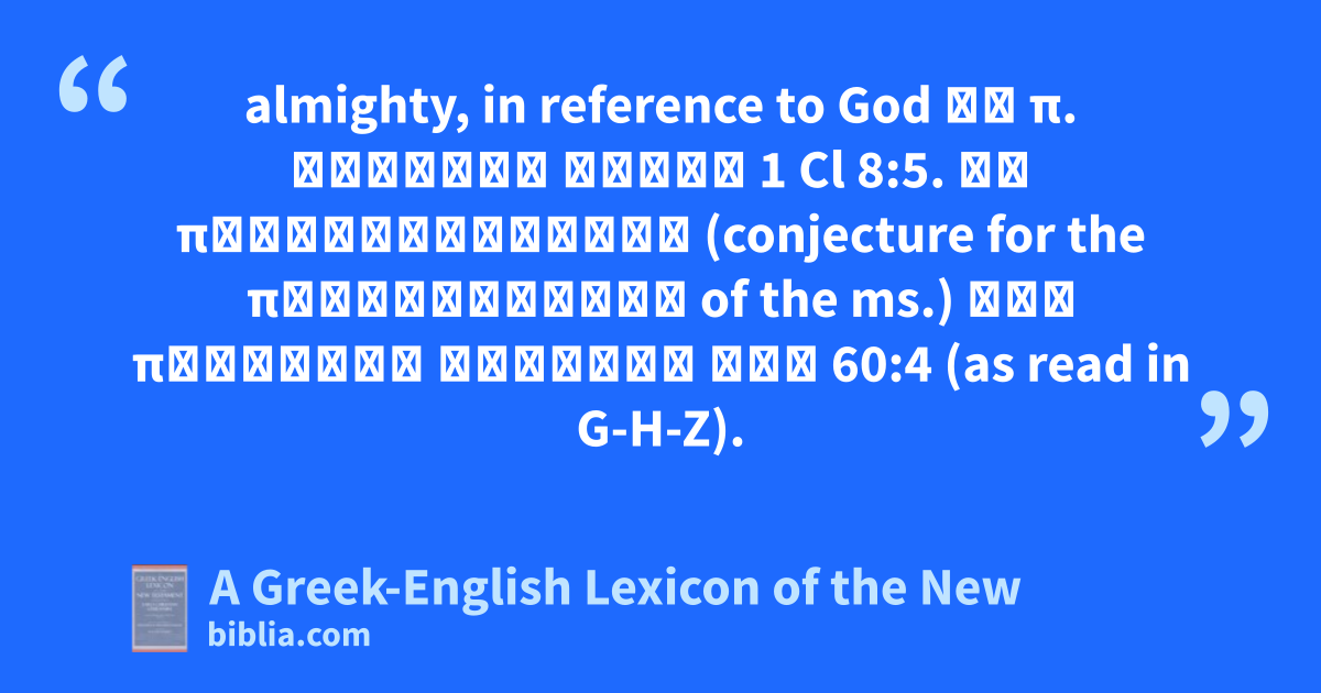 almighty, in reference to God τὸ π. βούλημα αὐτοῦ 1 Cl 8:5. τῷ παντοκρατορικῷ (conjecture for the παντοκράτορι of the ms.) καὶ παναρέτῳ ὀνόματί σου 60:4 (as read in G-H-Z).