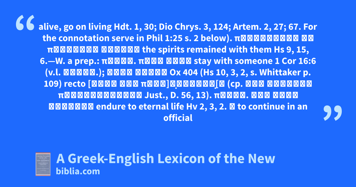 alive, go on living Hdt. 1, 30; Dio Chrys. 3, 124; Artem. 2, 27; 67. For the connotation serve in Phil 1:25 s. 2 below). παρέμειναν τὰ πνεύματα αὐτοῖς the spirits remained with them Hs 9, 15, 6.—W. a prep.: παραμ. πρός τινα stay with someone 1 Cor 16:6 (v.l. καταμ.); μετά τινος Ox 404 (Hs 10, 3, 2, s. Whittaker p. 109) recto [μετὰ σοῦ παρα]μ̣ένουσι̣[ν (cp. σὺν Τρύφωνι παραμεινάντων Just., D. 56, 13). παραμ. εἰς ζωὴν αἰώνιον endure to eternal life Hv 2, 3, 2. ② to continue in an official