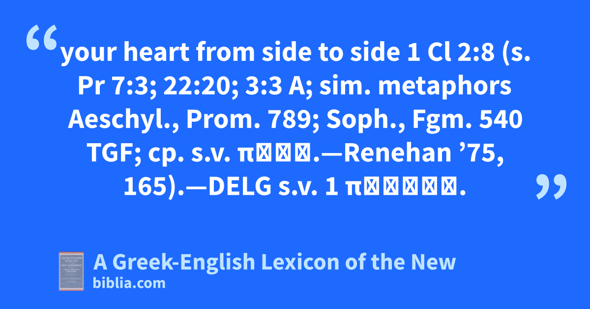 your heart from side to side 1 Cl 2:8 (s. Pr 7:3; 22:20; 3:3 A; sim. metaphors Aeschyl., Prom. 789; Soph., Fgm. 540 TGF; cp. s.v. πλάξ.—Renehan ’75, 165).—DELG s.v. 1 πλατύς.