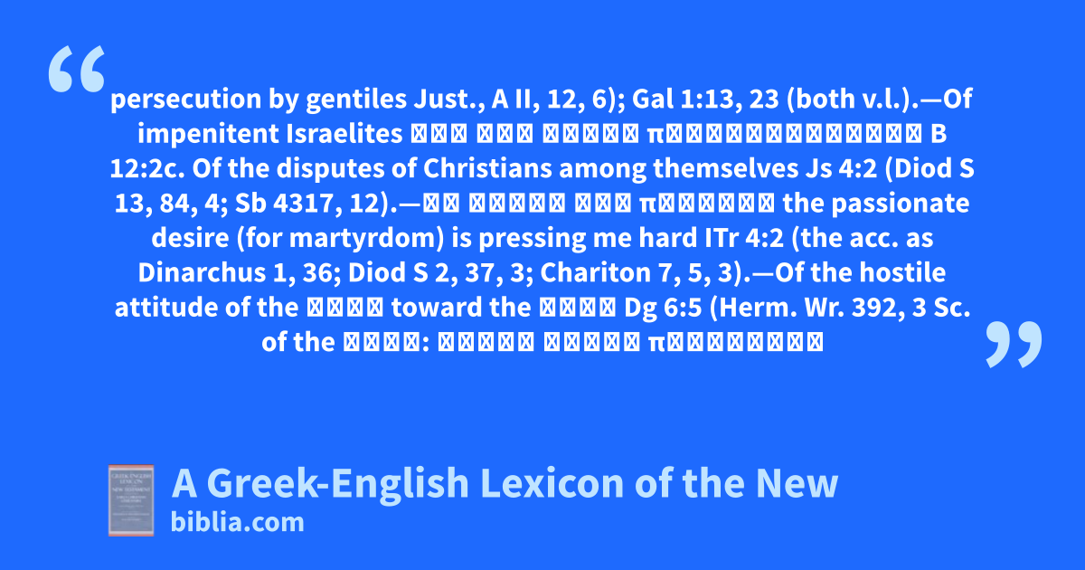 persecution by gentiles Just., A II, 12, 6); Gal 1:13, 23 (both v.l.).—Of impenitent Israelites εἰς τὸν αἰῶνα πολεμηθήσονται B 12:2c. Of the disputes of Christians among themselves Js 4:2 (Diod S 13, 84, 4; Sb 4317, 12).—τὸ ζῆλος ἐμὲ πολεμεῖ the passionate desire (for martyrdom) is pressing me hard ITr 4:2 (the acc. as Dinarchus 1, 36; Diod S 2, 37, 3; Chariton 7, 5, 3).—Of the hostile attitude of the σάρξ toward the ψυχή Dg 6:5 (Herm. Wr. 392, 3 Sc. of the ψυχή: αὐτὴν ἑαυτῇ πολεμῆσαι