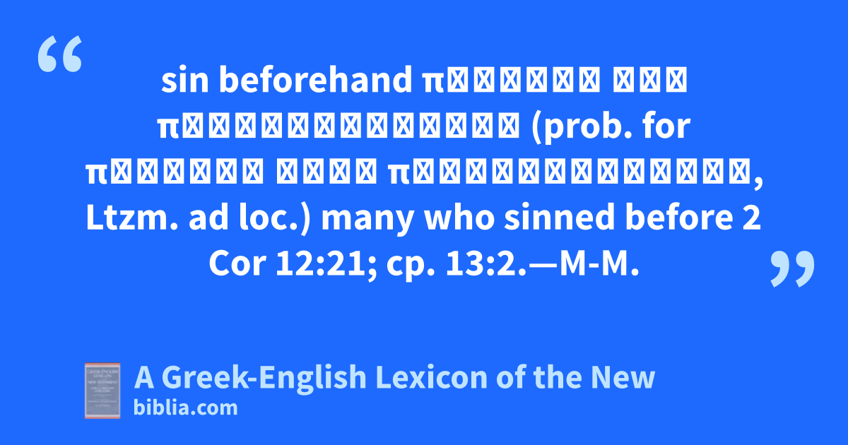 sin beforehand πολλοὺς τῶν προημαρτηκότων (prob. for πολλοὺς τοὺς προημαρτηκότας, Ltzm. ad loc.) many who sinned before 2 Cor 12:21; cp. 13:2.—M-M.