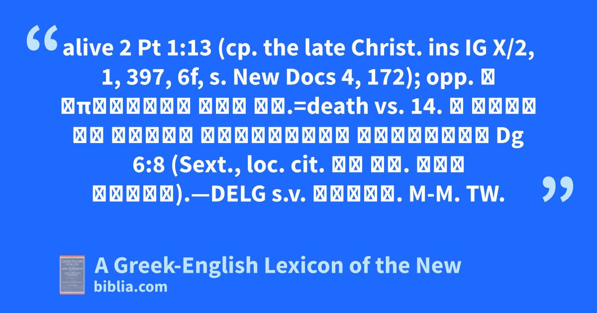 alive 2 Pt 1:13 (cp. the late Christ. ins IG X/2, 1, 397, 6f, s. New Docs 4, 172); opp. ἡ ἀπόθεσις τοῦ σκ.=death vs. 14. ἡ ψυχὴ ἐν θνητῷ σκηνώματι κατοικεῖ Dg 6:8 (Sext., loc. cit. τὸ σ‌. τῆς ψυχῆς).—DELG s.v. σκηνή. M-M. TW.