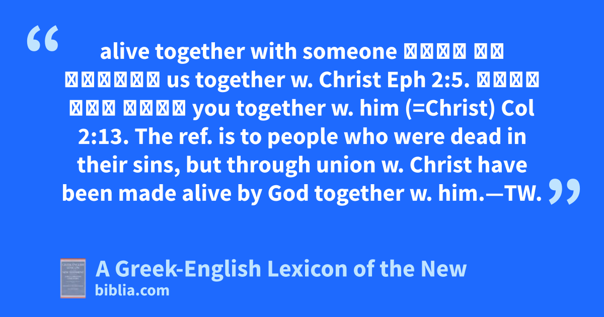 alive together with someone ἡμᾶς τῷ Χριστῷ us together w. Christ Eph 2:5. ὑμᾶς σὺν αὐτῷ you together w. him (=Christ) Col 2:13. The ref. is to people who were dead in their sins, but through union w. Christ have been made alive by God together w. him.—TW.