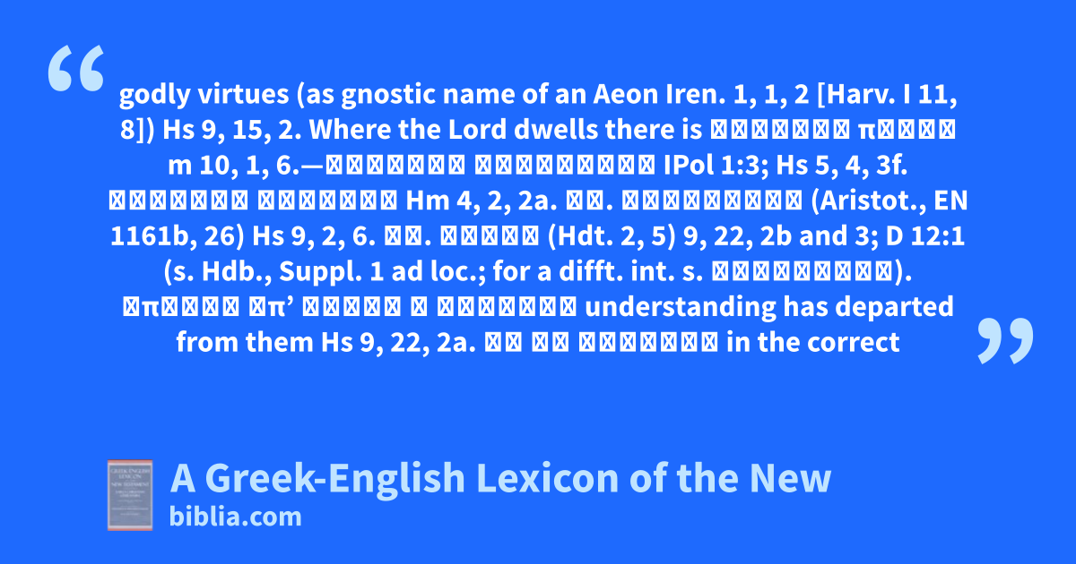 godly virtues (as gnostic name of an Aeon Iren. 1, 1, 2 [Harv. I 11, 8]) Hs 9, 15, 2. Where the Lord dwells there is σύνεσις πολλή m 10, 1, 6.—σύνεσιν αἰτεῖσθαι IPol 1:3; Hs 5, 4, 3f. σύνεσιν διδόναι Hm 4, 2, 2a. σ‌. λαμβάνειν (Aristot., EN 1161b, 26) Hs 9, 2, 6. σ‌. ἔχειν (Hdt. 2, 5) 9, 22, 2b and 3; D 12:1 (s. Hdb., Suppl. 1 ad loc.; for a difft. int. s. ἀριστερός). ἀπέστη ἀπʼ αὐτῶν ἡ σύνεσις understanding has departed from them Hs 9, 22, 2a. ἐν τῇ συνέσει in the correct
