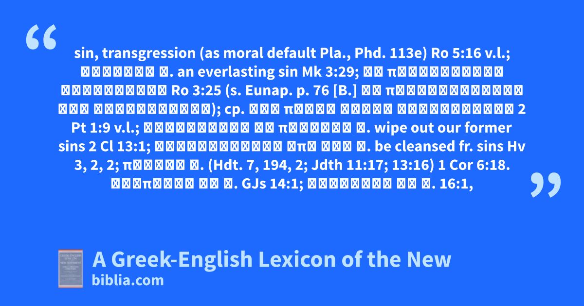 sin, transgression (as moral default Pla., Phd. 113e) Ro 5:16 v.l.; αἰώνιον ἁ. an everlasting sin Mk 3:29; τὰ προγεγονότα ἁμαρτήματα Ro 3:25 (s. Eunap. p. 76 [B.] τὰ προγεγενημένα τῶν ἁμαρτημάτων); cp. τῶν πάλαι αὐτοῦ ἁμαρτημάτων 2 Pt 1:9 v.l.; ἐξαλείφειν τὰ πρότερα ἁ. wipe out our former sins 2 Cl 13:1; καθαρίζεσθαι ἀπὸ τῶν ἁ. be cleansed fr. sins Hv 3, 2, 2; ποιεῖν ἁ. (Hdt. 7, 194, 2; Jdth 11:17; 13:16) 1 Cor 6:18. κρύπτειν τὸ ἁ. GJs 14:1; φανεροῦν τὸ ἁ. 16:1,
