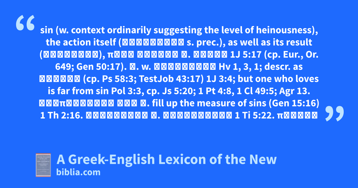 sin (w. context ordinarily suggesting the level of heinousness), the action itself (ἁμάρτησις s. prec.), as well as its result (ἁμάρτημα), πᾶσα ἀδικία ἁ. ἐστίν 1J 5:17 (cp. Eur., Or. 649; Gen 50:17). ἁ. w. ἀνομήματα Hv 1, 3, 1; descr. as ἀνομία (cp. Ps 58:3; TestJob 43:17) 1J 3:4; but one who loves is far from sin Pol 3:3, cp. Js 5:20; 1 Pt 4:8, 1 Cl 49:5; Agr 13. ἀναπληρῶσαι τὰς ἁ. fill up the measure of sins (Gen 15:16) 1 Th 2:16. κοινωνεῖν ἁ. ἀλλοτρίαις 1 Ti 5:22. ποιεῖν