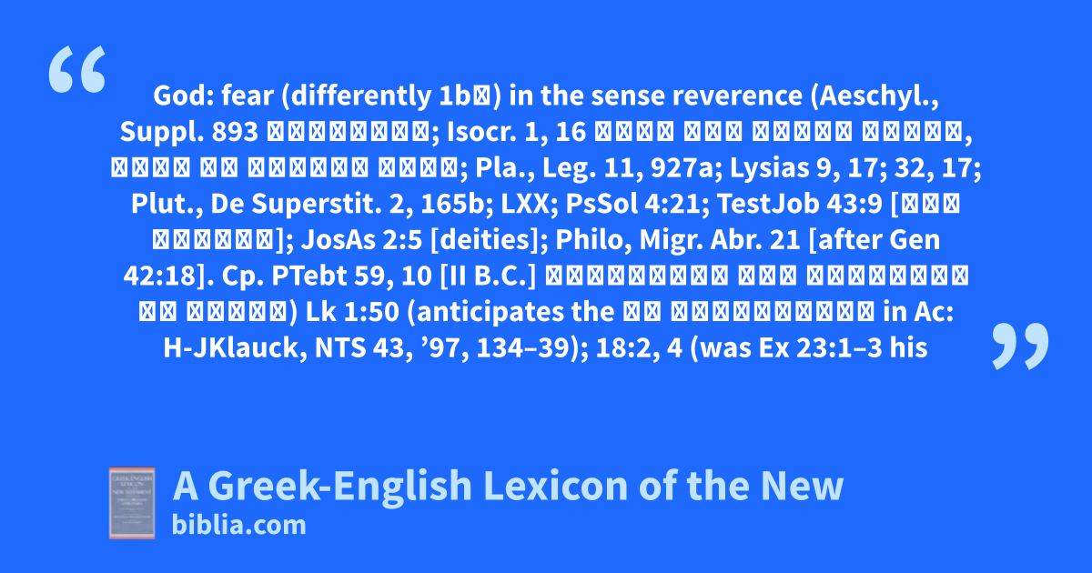 God: fear (differently 1bα) in the sense reverence (Aeschyl., Suppl. 893 δαίμονας; Isocr. 1, 16 τοὺς μὲν θεοὺς φοβοῦ, τοὺς δὲ γονεῖς τίμα; Pla., Leg. 11, 927a; Lysias 9, 17; 32, 17; Plut., De Superstit. 2, 165b; LXX; PsSol 4:21; TestJob 43:9 [τὸν κύριον]; JosAs 2:5 [deities]; Philo, Migr. Abr. 21 [after Gen 42:18]. Cp. PTebt 59, 10 [II B.C.] φοβεῖσθαι καὶ σέβεσθαι τὸ ἱερόν) Lk 1:50 (anticipates the οἱ φοβούμενοι in Ac: H-JKlauck, NTS 43, ’97, 134–39); 18:2, 4 (was Ex 23:1–3 his
