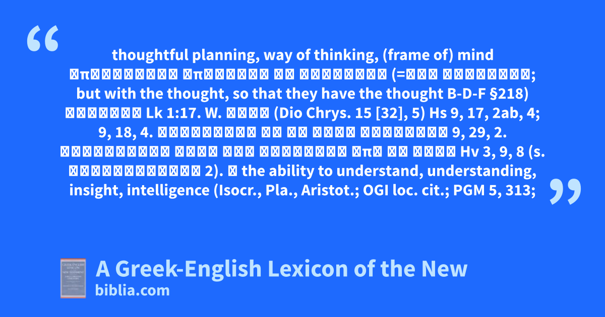 thoughtful planning, way of thinking, (frame of) mind ἐπιστρέψαι ἀπειθεῖς ἐν φρονήσει (=εἰς φρόνησιν; but with the thought, so that they have the thought B-D-F §218) δικαίων Lk 1:17. W. νοῦς (Dio Chrys. 15 [32], 5) Hs 9, 17, 2ab, 4; 9, 18, 4. διέμειναν ἐν τῇ αὐτῇ φρονήσει 9, 29, 2. συγκεράσαι ὑμῶν τὴν φρόνησιν ἐπὶ τὸ αὐτό Hv 3, 9, 8 (s. συγκεράννυμι 2). ② the ability to understand, understanding, insight, intelligence (Isocr., Pla., Aristot.; OGI loc. cit.; PGM 5, 313;