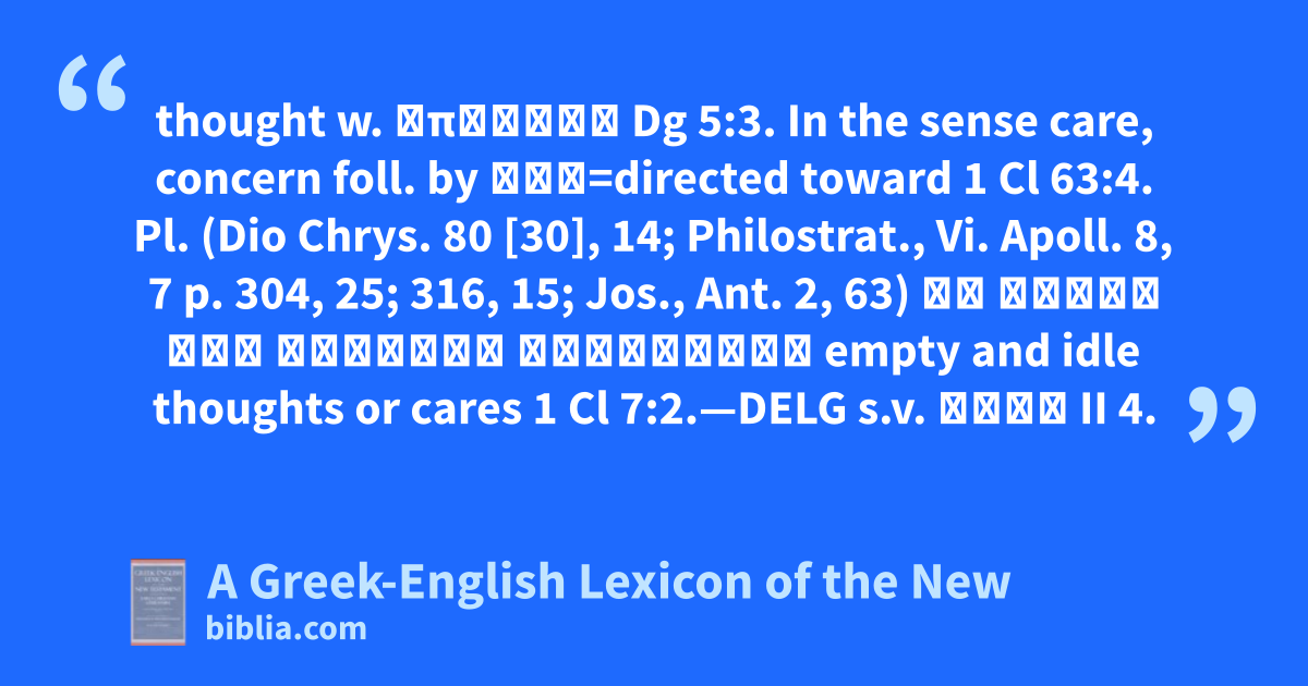 thought w. ἐπίνοια Dg 5:3. In the sense care, concern foll. by εἰς=directed toward 1 Cl 63:4. Pl. (Dio Chrys. 80 [30], 14; Philostrat., Vi. Apoll. 8, 7 p. 304, 25; 316, 15; Jos., Ant. 2, 63) αἱ κεναὶ καὶ μάταιαι φροντίδες empty and idle thoughts or cares 1 Cl 7:2.—DELG s.v. φρήν II 4.