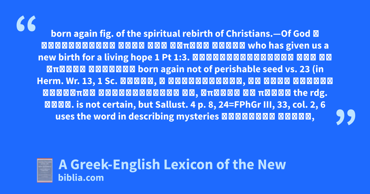 born again fig. of the spiritual rebirth of Christians.—Of God ὁ ἀναγεννήσας ἡμᾶς εἰς ἐλπίδα ζῶσαν who has given us a new birth for a living hope 1 Pt 1:3. ἀναγεγεννημένοι οὐκ ἐκ σπορᾶς φθαρτῆς born again not of perishable seed vs. 23 (in Herm. Wr. 13, 1 Sc. ἀγνοῶ, ὦ τρισμέγιστε, ἐξ οἵας μήτρας ἄνθρωπος ἀναγεννηθείη ἄν, σπορᾶς δὲ ποίας the rdg. ἀναγ. is not certain, but Sallust. 4 p. 8, 24=FPhGr III, 33, col. 2, 6 uses the word in describing mysteries γάλακτος τροφή,