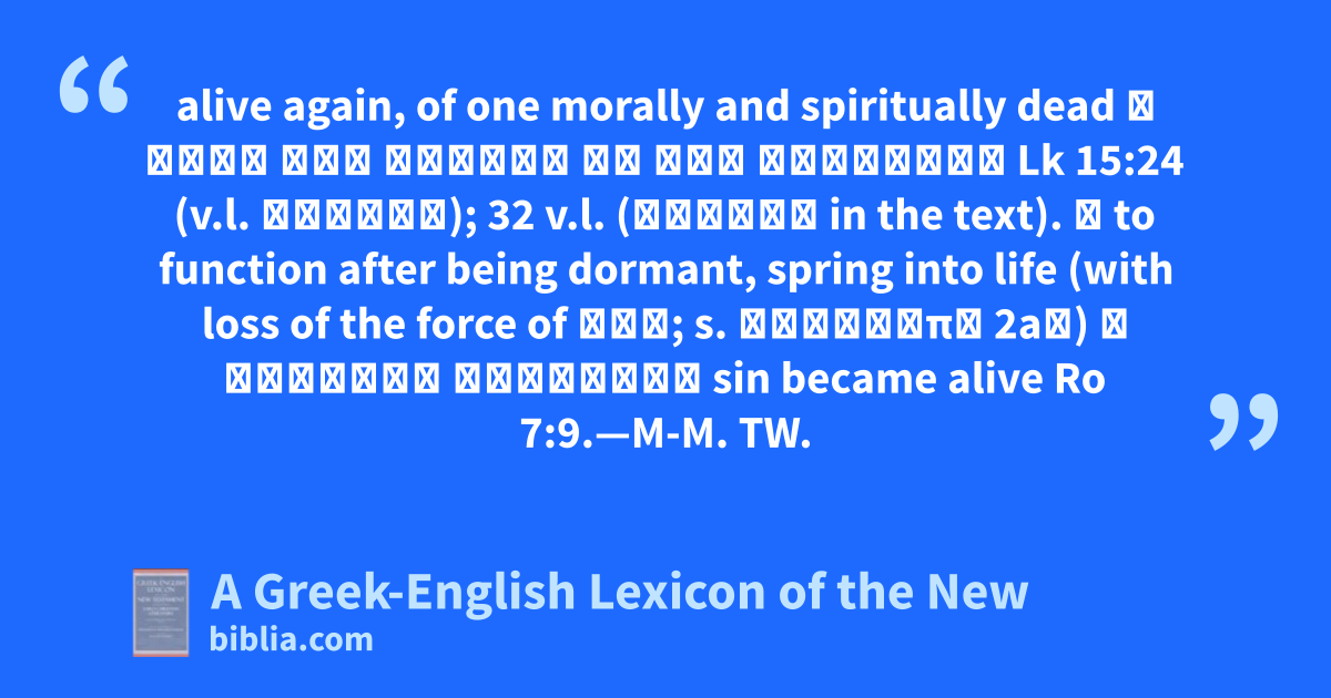 alive again, of one morally and spiritually dead ὁ υἱός μου νεκρὸς ἦν καὶ ἀνέζησεν Lk 15:24 (v.l. ἔζησεν); 32 v.l. (ἔζησεν in the text). ② to function after being dormant, spring into life (with loss of the force of ἀνά; s. ἀναβλέπω 2aβ) ἡ ἁμαρτία ἀνέζησεν sin became alive Ro 7:9.—M-M. TW.