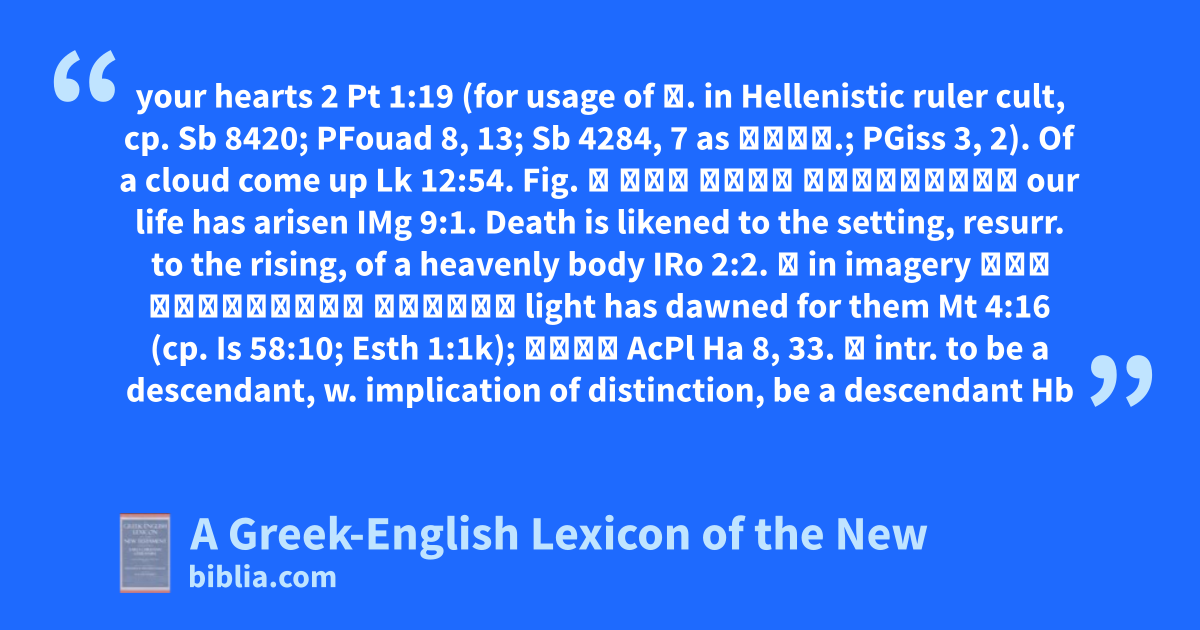 your hearts 2 Pt 1:19 (for usage of ἀ. in Hellenistic ruler cult, cp. Sb 8420; PFouad 8, 13; Sb 4284, 7 as συνα.; PGiss 3, 2). Of a cloud come up Lk 12:54. Fig. ἡ ζωὴ ἡμῶν ἀνέτειλεν our life has arisen IMg 9:1. Death is likened to the setting, resurr. to the rising, of a heavenly body IRo 2:2. ⓑ in imagery φῶς ἀνέτειλεν αὐτοῖς light has dawned for them Mt 4:16 (cp. Is 58:10; Esth 1:1k); ὑμῖν AcPl Ha 8, 33. ③ intr. to be a descendant, w. implication of distinction, be a descendant Hb