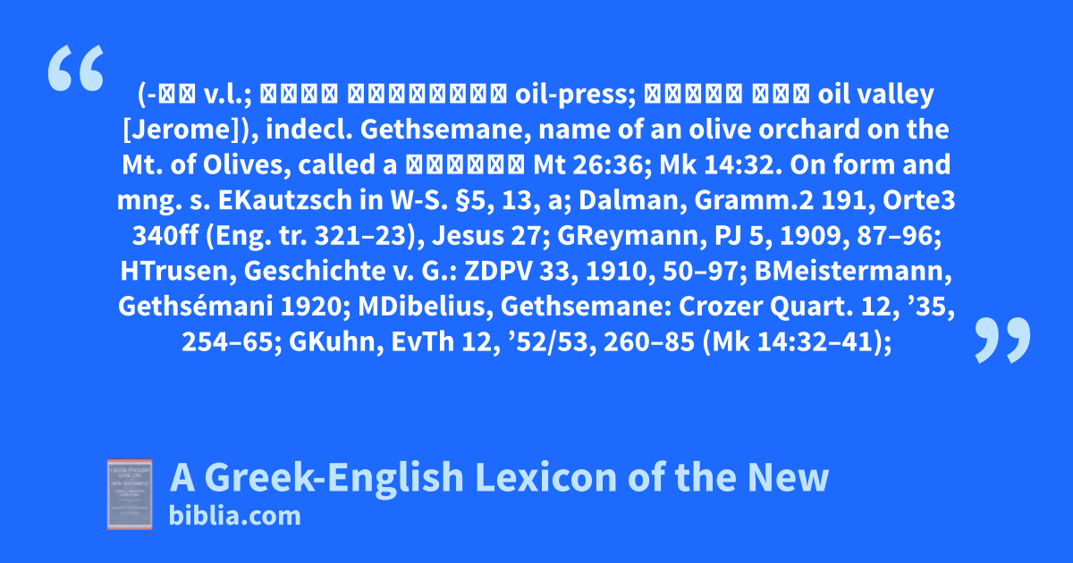 (-νῆ v.l.; גַּת שְׁמָנֵי oil-press; גֵּיא שׁ׳ oil valley [Jerome]), indecl. Gethsemane, name of an olive orchard on the Mt. of Olives, called a χωρίον Mt 26:36; Mk 14:32. On form and mng. s. EKautzsch in W-S. §5, 13, a; Dalman, Gramm.2 191, Orte3 340ff (Eng. tr. 321–23), Jesus 27; GReymann, PJ 5, 1909, 87–96; HTrusen, Geschichte v. G.: ZDPV 33, 1910, 50–97; BMeistermann, Gethsémani 1920; MDibelius, Gethsemane: Crozer Quart. 12, ’35, 254–65; GKuhn, EvTh 12, ’52/53, 260–85 (Mk 14:32–41);