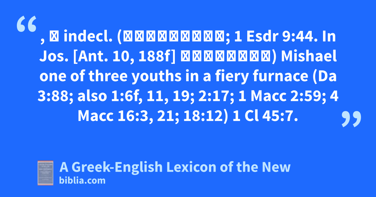 , ὁ indecl. (מִישָׁאֵל; 1 Esdr 9:44. In Jos. [Ant. 10, 188f] Μισάηλος) Mishael one of three youths in a fiery furnace (Da 3:88; also 1:6f, 11, 19; 2:17; 1 Macc 2:59; 4 Macc 16:3, 21; 18:12) 1 Cl 45:7.