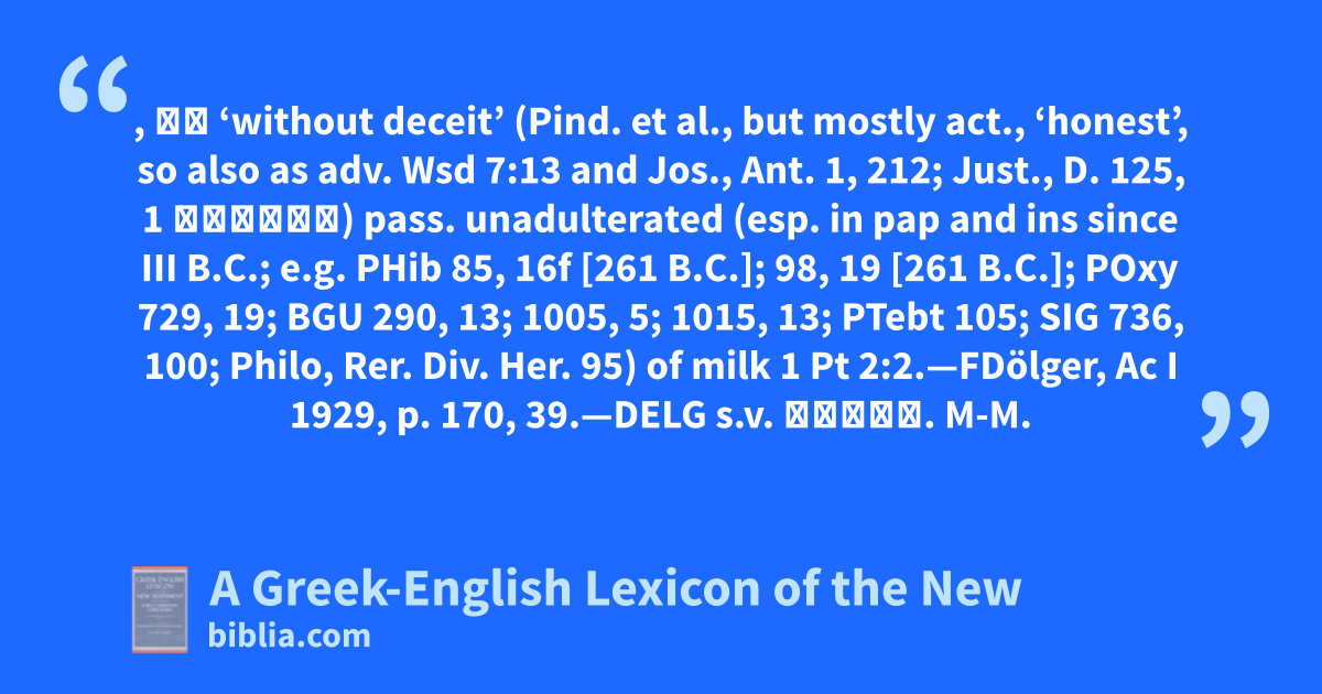 , ον ‘without deceit’ (Pind. et al., but mostly act., ‘honest’, so also as adv. Wsd 7:13 and Jos., Ant. 1, 212; Just., D. 125, 1 ἀδόλως) pass. unadulterated (esp. in pap and ins since III B.C.; e.g. PHib 85, 16f [261 B.C.]; 98, 19 [261 B.C.]; POxy 729, 19; BGU 290, 13; 1005, 5; 1015, 13; PTebt 105; SIG 736, 100; Philo, Rer. Div. Her. 95) of milk 1 Pt 2:2.—FDölger, Ac I 1929, p. 170, 39.—DELG s.v. δόλος. M-M.