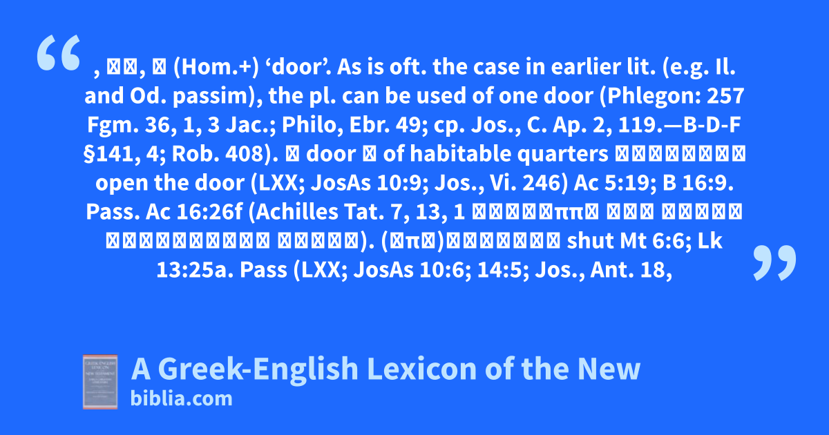 , ας, ἡ (Hom.+) ‘door’. As is oft. the case in earlier lit. (e.g. Il. and Od. passim), the pl. can be used of one door (Phlegon: 257 Fgm. 36, 1, 3 Jac.; Philo, Ebr. 49; cp. Jos., C. Ap. 2, 119.—B-D-F §141, 4; Rob. 408). ① door ⓐ of habitable quarters ἀνοίγειν open the door (LXX; JosAs 10:9; Jos., Vi. 246) Ac 5:19; B 16:9. Pass. Ac 16:26f (Achilles Tat. 7, 13, 1 Λευκίππη τὰς θύρας ἀνεῳγμένας ὁρῶσα). (ἀπο)κλείειν shut Mt 6:6; Lk 13:25a. Pass (LXX; JosAs 10:6; 14:5; Jos., Ant. 18,