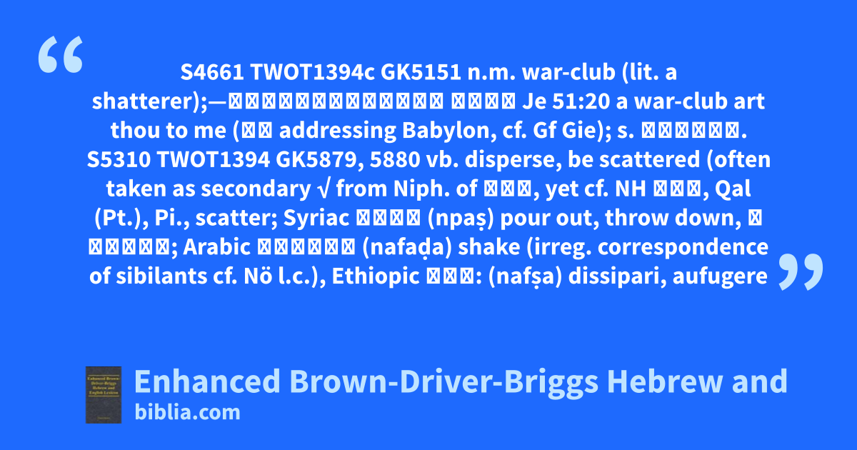S4661 TWOT1394c GK5151 n.m. war-club (lit. a shatterer);—מַפֵּץ־אַתָּה לִיּ Je 51:20 a war-club art thou to me (י׳ addressing Babylon, cf. Gf Gie); s. מֵפִיץ. S5310 TWOT1394 GK5879, 5880 vb. disperse, be scattered (often taken as secondary √ from Niph. of פוץ, yet cf. NH נפץ, Qal (Pt.), Pi., scatter; Syriac ܢܦܰܨ (npaṣ) pour out, throw down, 𝔗 נְפַץ; Arabic نَفَضَ (nafaḍa) shake (irreg. correspondence of sibilants cf. Nö l.c.), Ethiopic ነፍጸ: (nafṣa) dissipari, aufugere