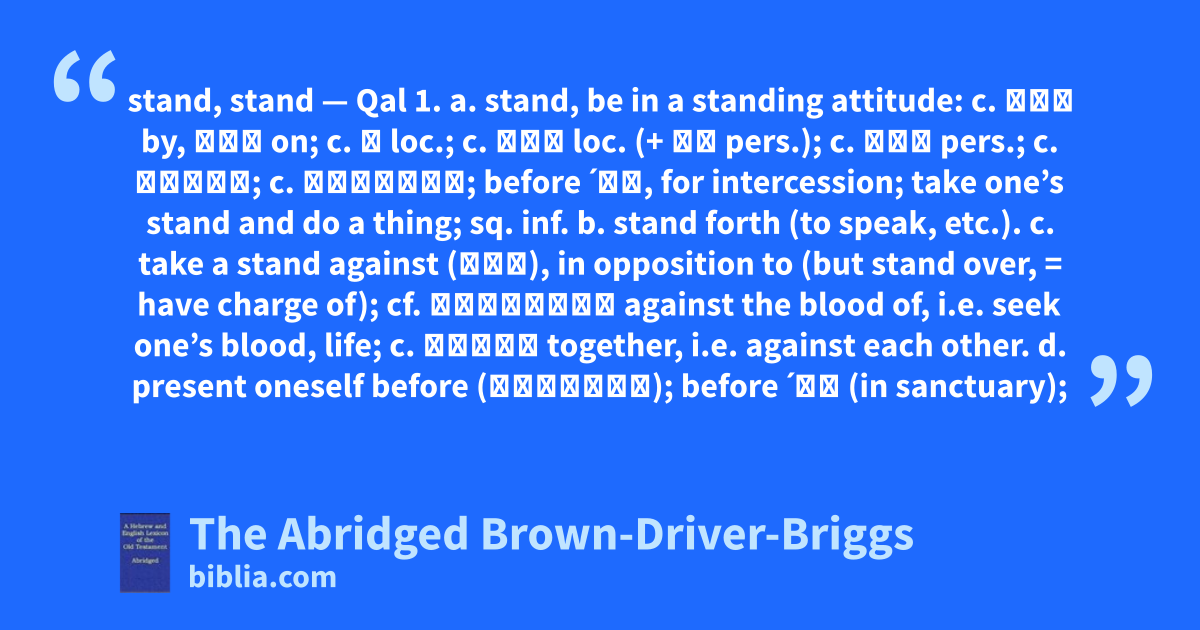 stand, stand — Qal 1. a. stand, be in a standing attitude: c. עַל by, עַל on; c. ב loc.; c. אֶל loc. (+ לְ pers.); c. אֶל pers.; c. אֵצֶל; c. לִפְנֵי; before ˊי‍, for intercession; take one’s stand and do a thing; sq. inf. b. stand forth (to speak, etc.). c. take a stand against (עַל), in opposition to (but stand over, = have charge of); cf. עַל־דַּם against the blood of, i.e. seek one’s blood, life; c. יָחַד together, i.e. against each other. d. present oneself before (לִפְנֵי); before ˊי‍ (in sanctuary);
