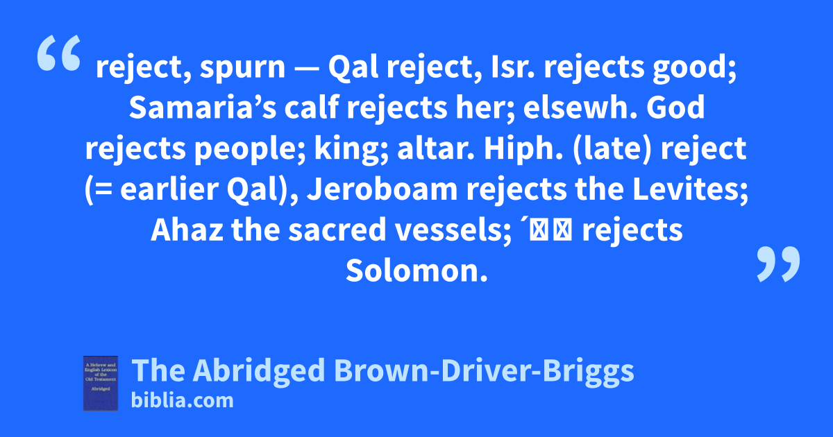 reject, spurn — Qal reject, Isr. rejects good; Samaria’s calf rejects her; elsewh. God rejects people; king; altar. Hiph. (late) reject (= earlier Qal), Jeroboam rejects the Levites; Ahaz the sacred vessels; ˊי‍ rejects Solomon.