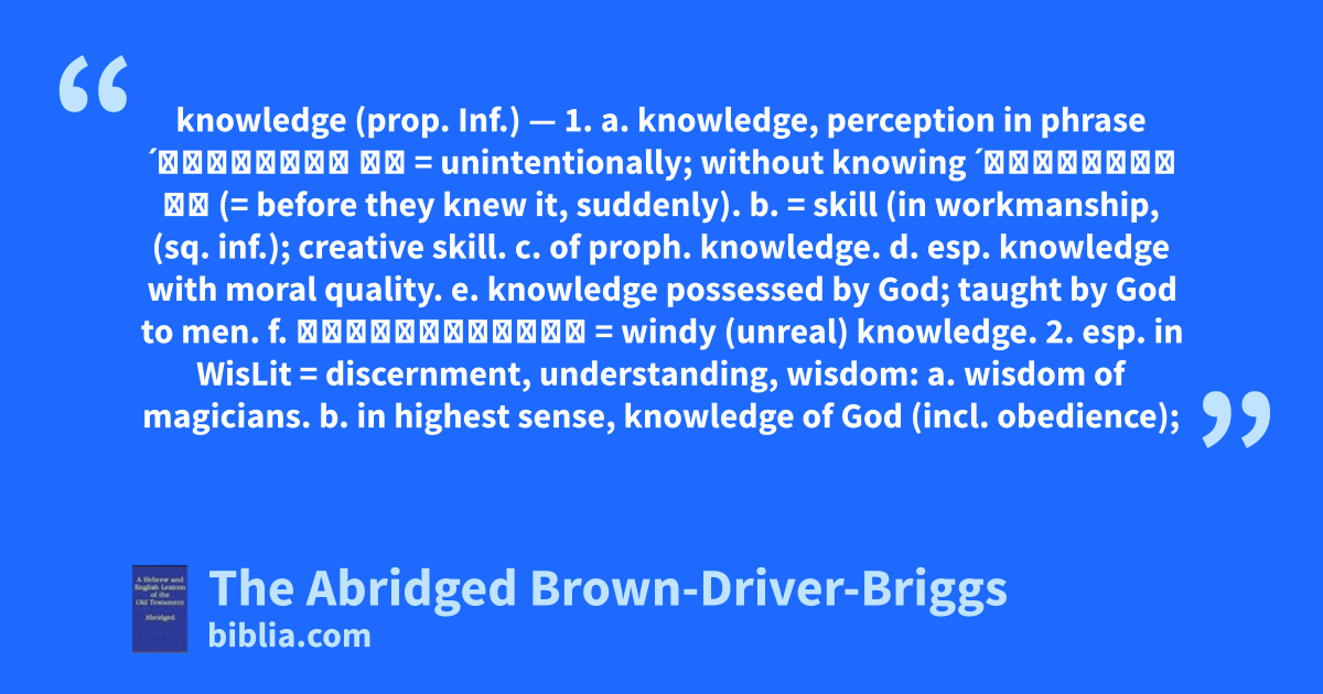 knowledge (prop. Inf.) — 1. a. knowledge, perception in phrase ˊבִּבְלִי ד‍ = unintentionally; without knowing ˊמִבְּלִי ד‍ (= before they knew it, suddenly). b. = skill (in workmanship, (sq. inf.); creative skill. c. of proph. knowledge. d. esp. knowledge with moral quality. e. knowledge possessed by God; taught by God to men. f. דַּעַת־רוּחַ = windy (unreal) knowledge. 2. esp. in WisLit = discernment, understanding, wisdom: a. wisdom of magicians. b. in highest sense, knowledge of God (incl. obedience);