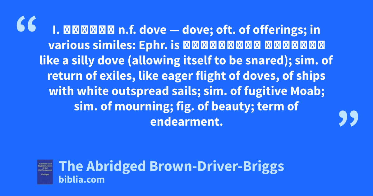 I. יוֹנָה n.f. dove — dove; oft. of offerings; in various similes: Ephr. is כְּיוֹנָה פּוֹתָה like a silly dove (allowing itself to be snared); sim. of return of exiles, like eager flight of doves, of ships with white outspread sails; sim. of fugitive Moab; sim. of mourning; fig. of beauty; term of endearment.