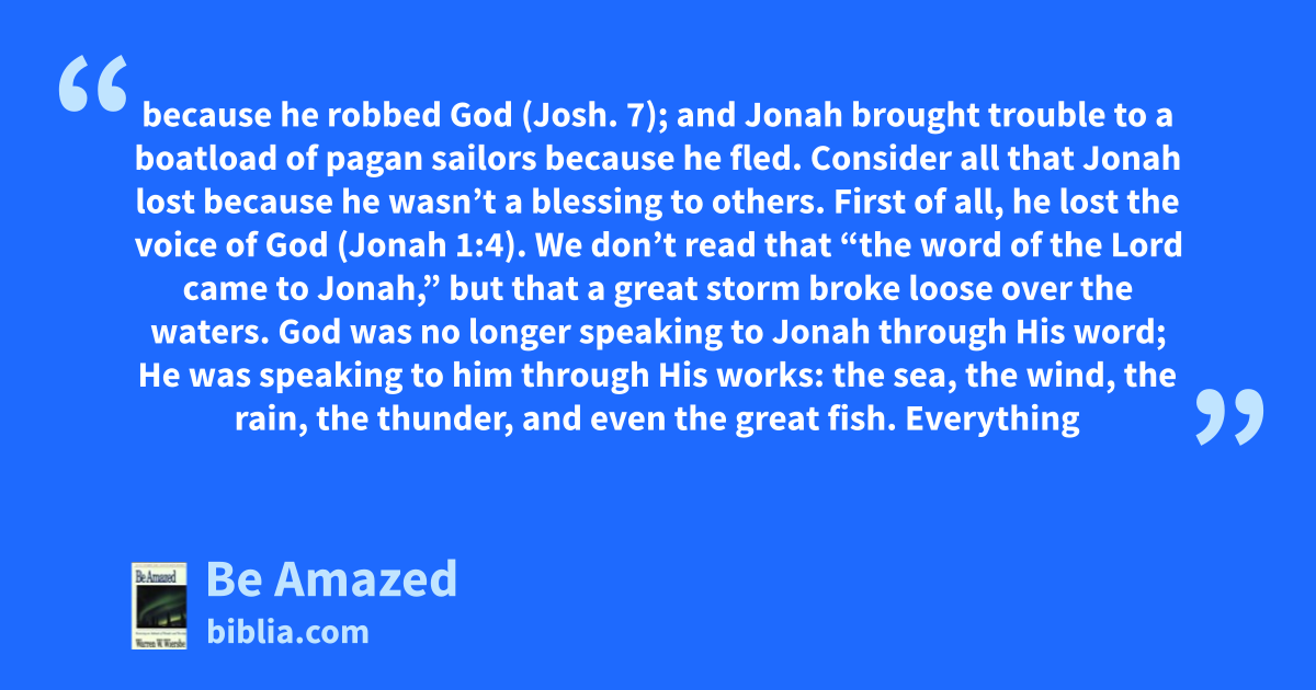 because he robbed God (Josh. 7); and Jonah brought trouble to a boatload of pagan sailors because he fled. Consider all that Jonah lost because he wasn’t a blessing to others. First of all, he lost the voice of God (Jonah 1:4). We don’t read that “the word of the Lord came to Jonah,” but that a great storm broke loose over the waters. God was no longer speaking to Jonah through His word; He was speaking to him through His works: the sea, the wind, the rain, the thunder, and even the great fish. Everything