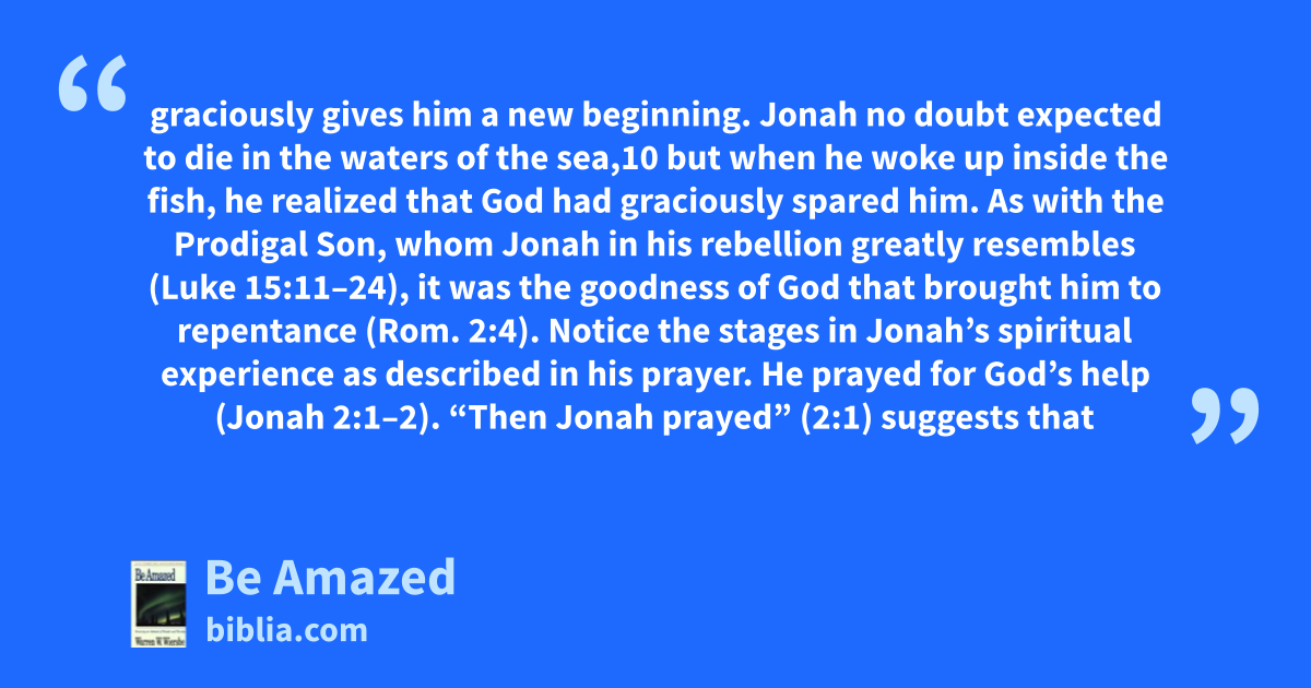 graciously gives him a new beginning. Jonah no doubt expected to die in the waters of the sea,10 but when he woke up inside the fish, he realized that God had graciously spared him. As with the Prodigal Son, whom Jonah in his rebellion greatly resembles (Luke 15:11–24), it was the goodness of God that brought him to repentance (Rom. 2:4). Notice the stages in Jonah’s spiritual experience as described in his prayer. He prayed for God’s help (Jonah 2:1–2). “Then Jonah prayed” (2:1) suggests that