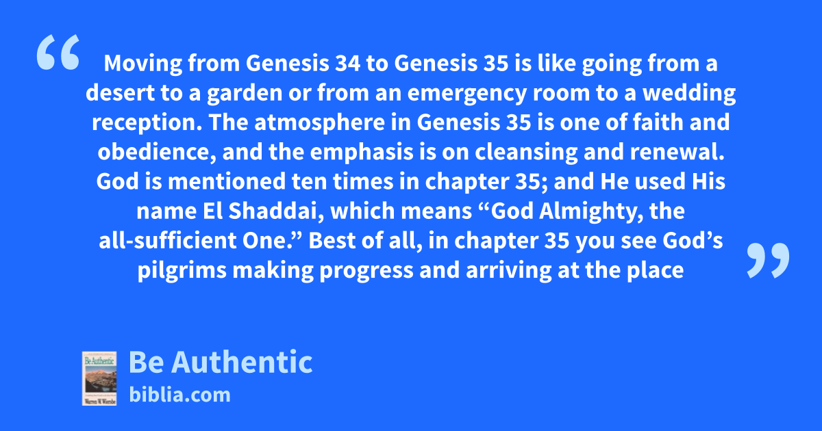 Moving from Genesis 34 to Genesis 35 is like going from a desert to a garden or from an emergency room to a wedding reception. The atmosphere in Genesis 35 is one of faith and obedience, and the emphasis is on cleansing and renewal. God is mentioned ten times in chapter 35; and He used His name El Shaddai, which means “God Almighty, the all-sufficient One.” Best of all, in chapter 35 you see God’s pilgrims making progress and arriving at the place