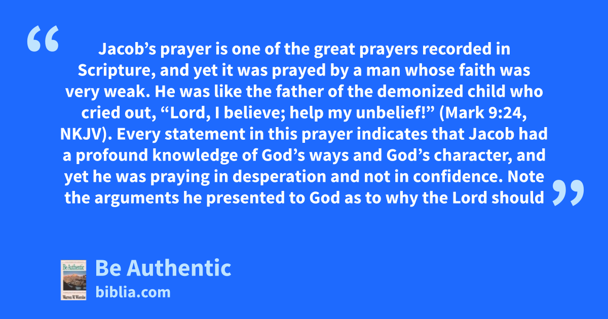 Jacob’s prayer is one of the great prayers recorded in Scripture, and yet it was prayed by a man whose faith was very weak. He was like the father of the demonized child who cried out, “Lord, I believe; help my unbelief!” (Mark 9:24, NKJV). Every statement in this prayer indicates that Jacob had a profound knowledge of God’s ways and God’s character, and yet he was praying in desperation and not in confidence. Note the arguments he presented to God as to why the Lord should