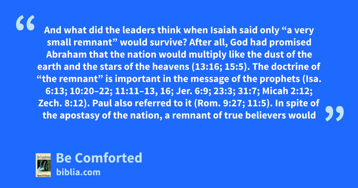 And what did the leaders think when Isaiah said only “a very small remnant” would survive? After all, God had promised Abraham that the nation would multiply like the dust of the earth and the stars of the heavens (13:16; 15:5). The doctrine of “the remnant” is important in the message of the prophets (Isa. 6:13; 10:20–22; 11:11–13, 16; Jer. 6:9; 23:3; 31:7; Micah 2:12; Zech. 8:12). Paul also referred to it (Rom. 9:27; 11:5). In spite of the apostasy of the nation, a remnant of true believers would
