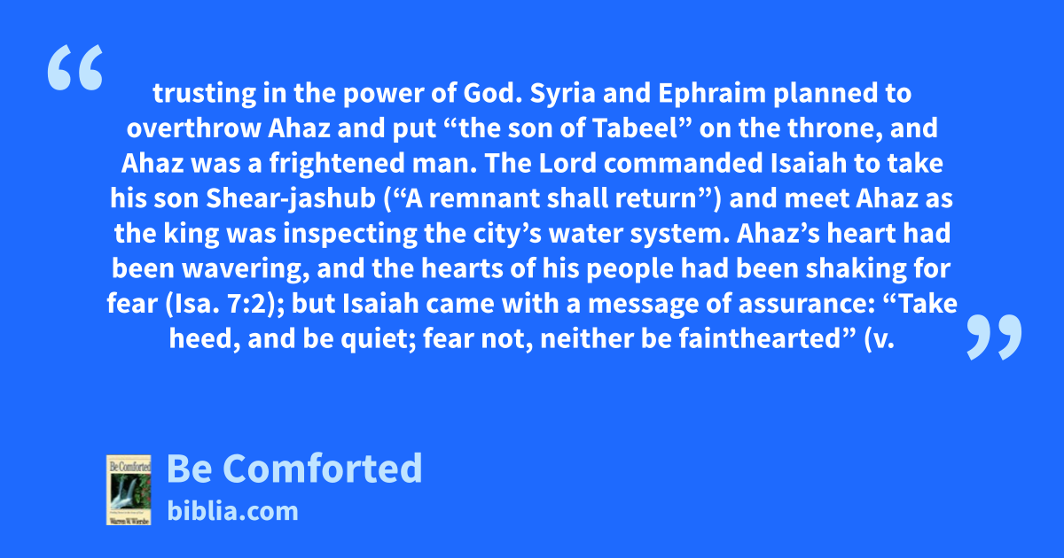 trusting in the power of God. Syria and Ephraim planned to overthrow Ahaz and put “the son of Tabeel” on the throne, and Ahaz was a frightened man. The Lord commanded Isaiah to take his son Shear-jashub (“A remnant shall return”) and meet Ahaz as the king was inspecting the city’s water system. Ahaz’s heart had been wavering, and the hearts of his people had been shaking for fear (Isa. 7:2); but Isaiah came with a message of assurance: “Take heed, and be quiet; fear not, neither be fainthearted” (v.