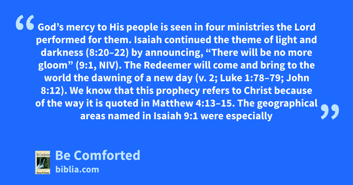 God’s mercy to His people is seen in four ministries the Lord performed for them. Isaiah continued the theme of light and darkness (8:20–22) by announcing, “There will be no more gloom” (9:1, NIV). The Redeemer will come and bring to the world the dawning of a new day (v. 2; Luke 1:78–79; John 8:12). We know that this prophecy refers to Christ because of the way it is quoted in Matthew 4:13–15. The geographical areas named in Isaiah 9:1 were especially